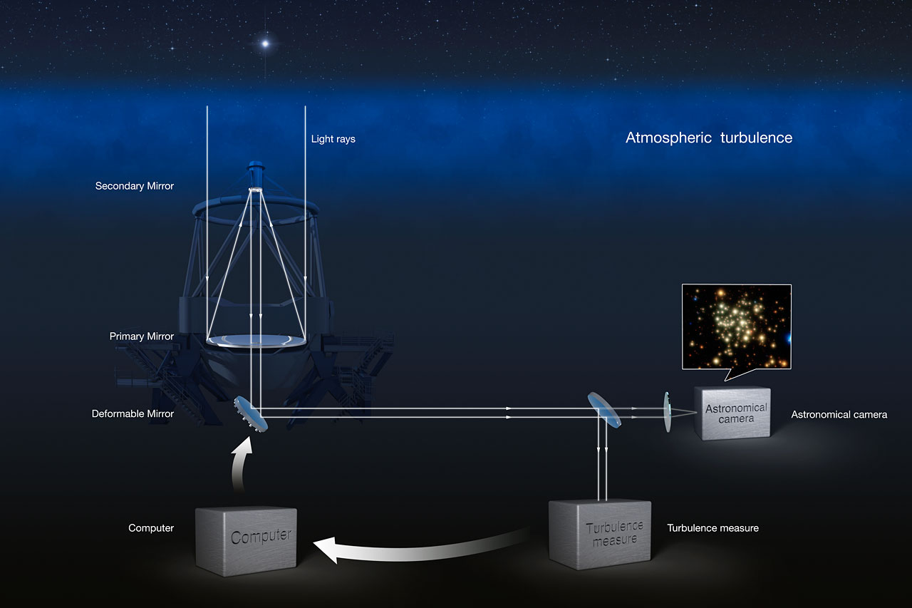 De techniek van de Laser Guide Star gaat gepaard met het gebruik van Adaptive Optics, dit zijn wendbare en aanpasbare spiegelsegmenten die de atmosferische storingen compenseren door een tegengestelde beweging te maken. Hoe elk spiegelsegment moet reageren wordt met behulp van krachtige computers berekend. In enkele milliseconden worden honderden berekeningen uitgevoerd en correcties doorgestuurd naar alle spiegelsegmenten.