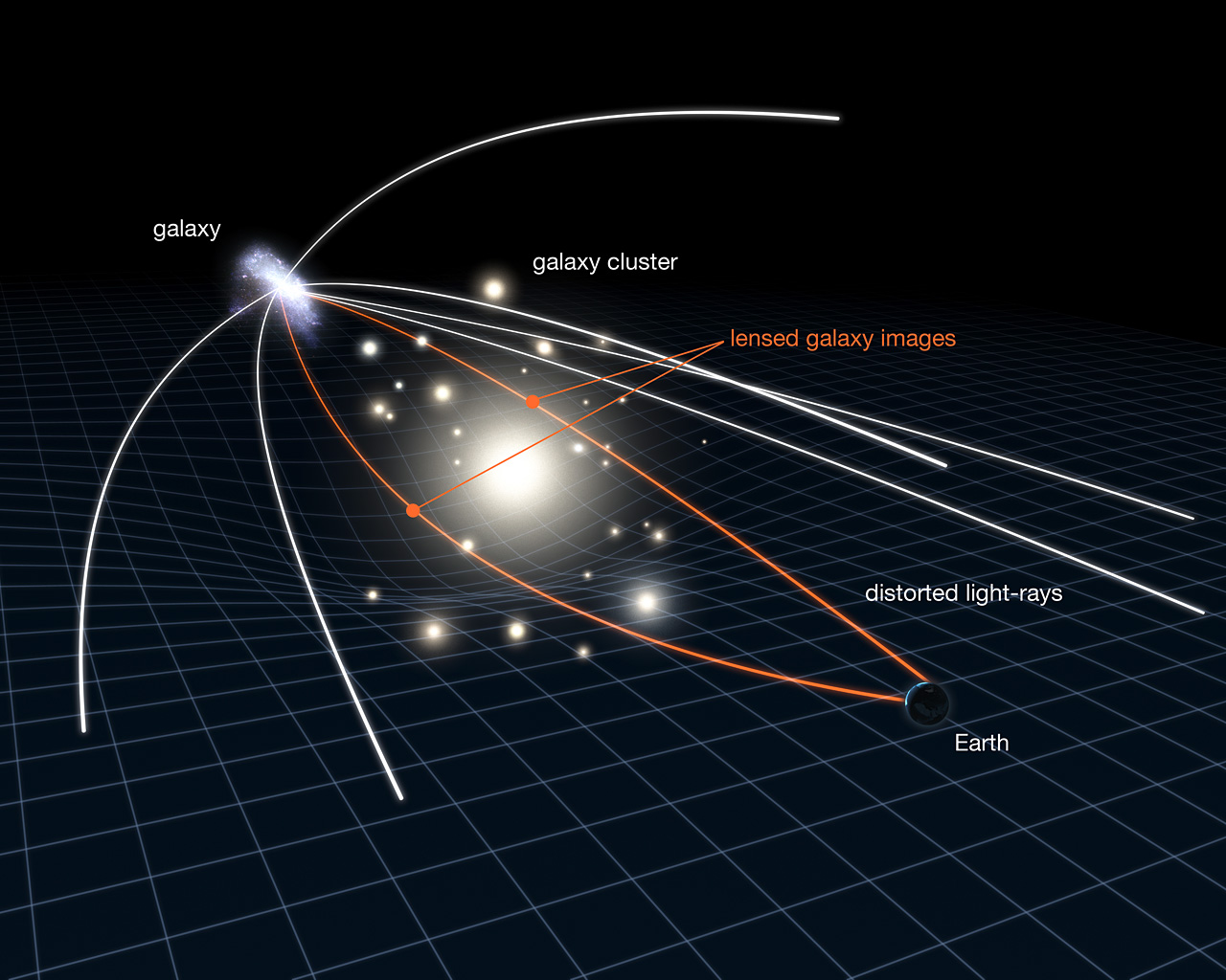 Het bestaan van donkere materie werd nog kracht bijgezet door de ontdekking van zwaartekrachtslenzen. Een dergelijke lens is een gevolg van de relativiteitstheorie die ons aangetoond heeft dat de ruimte gekromd wordt door een massa. Via ingewikkelde berekeningen is men erin geslaagd om uit de graad van de kromming van de ruimte rond sterrenclusters de massa van die clusters te meten. In de figuur hieronder wordt getoond hoe het licht van een melkwegstelsel door een tussenliggende cluster sterrenstelsels afgebogen wordt voor een waarnemer op Aarde. Aan de hand van de kromming kan men de massa van de cluster bepalen.