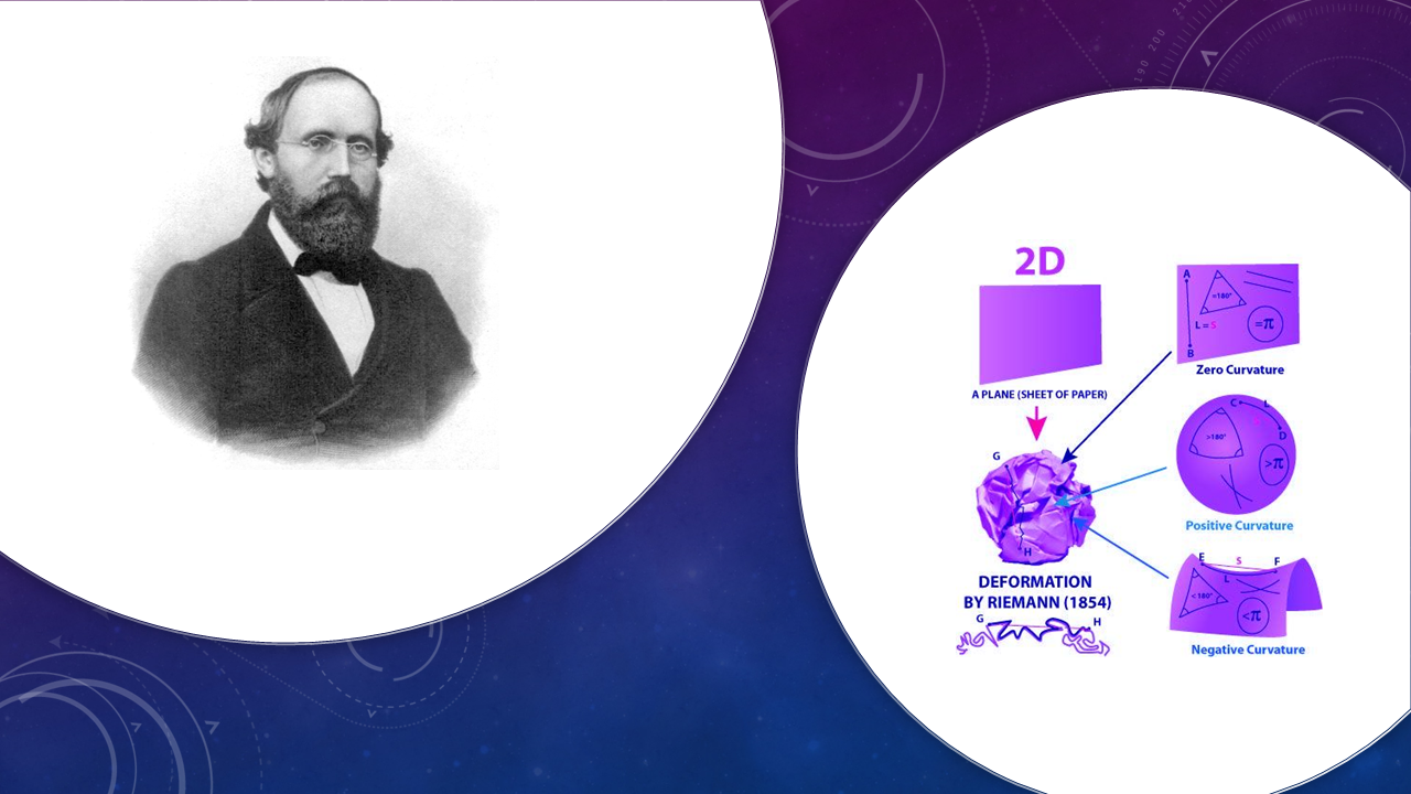 In het kader van dit artikel is echter vooral Riemanns werk over de meetkunde van belang. Hij stelde een meetkunde op die niet meer vanuit een driedimensionale ruimte moet benaderd worden, maar die ook gebruikt kan worden in een meerdimensionale gekromde ruimte, een meetkunde die toepasselijk is op positief gebogen oppervlakken. Andere belangrijke wiskundigen, zoals bijvoorbeeld Lobachevski en Bolyai, zouden Riemanns meetkunde verder uitwerken voor elliptische en hyperbolische ruimtes.