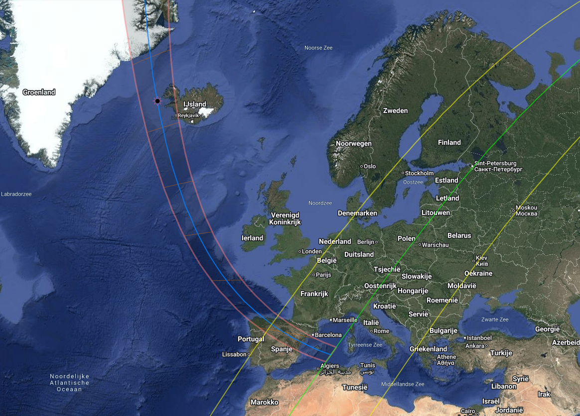 Onderstaand kaartje toont waar de eclips totaal is: de schaduw van de Maan komt aangesneld en bereikt het aardoppervlak boven Groenland. Dan schuift hij verder over het westen van IJsland en bereikt via de Atlantische Oceaan het Spaanse vasteland. Enkele minuten later is hij boven de Middellandse Zee. En boven Palma de Mallorca eindigt de totale zonsverduistering.