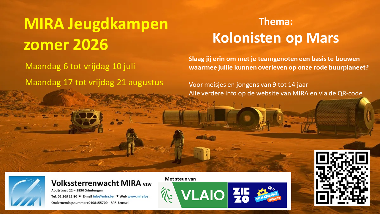 Aangezien we ons beperken tot maximaal 24 deelnemers is het best tijdig in te schrijven. Dat kan door ons eerst telefonisch of via e-mail te bevestigen dat je zoon of dochter effectief wil deelnemen aan onze jeugdkampen en vervolgens het volledige bedrag (€ 140) of een voorschot van € 40 over te schrijven op rekeningnummer BE67-0000-7722-0787 van Volkssterrenwacht MIRA met de vermelding Zomerkamp startdatum 2026 (in casu 6 juli of 17 augustus) + naam zoon/dochter. Die overschrijving doe je binnen de twee weken na je bevestiging.